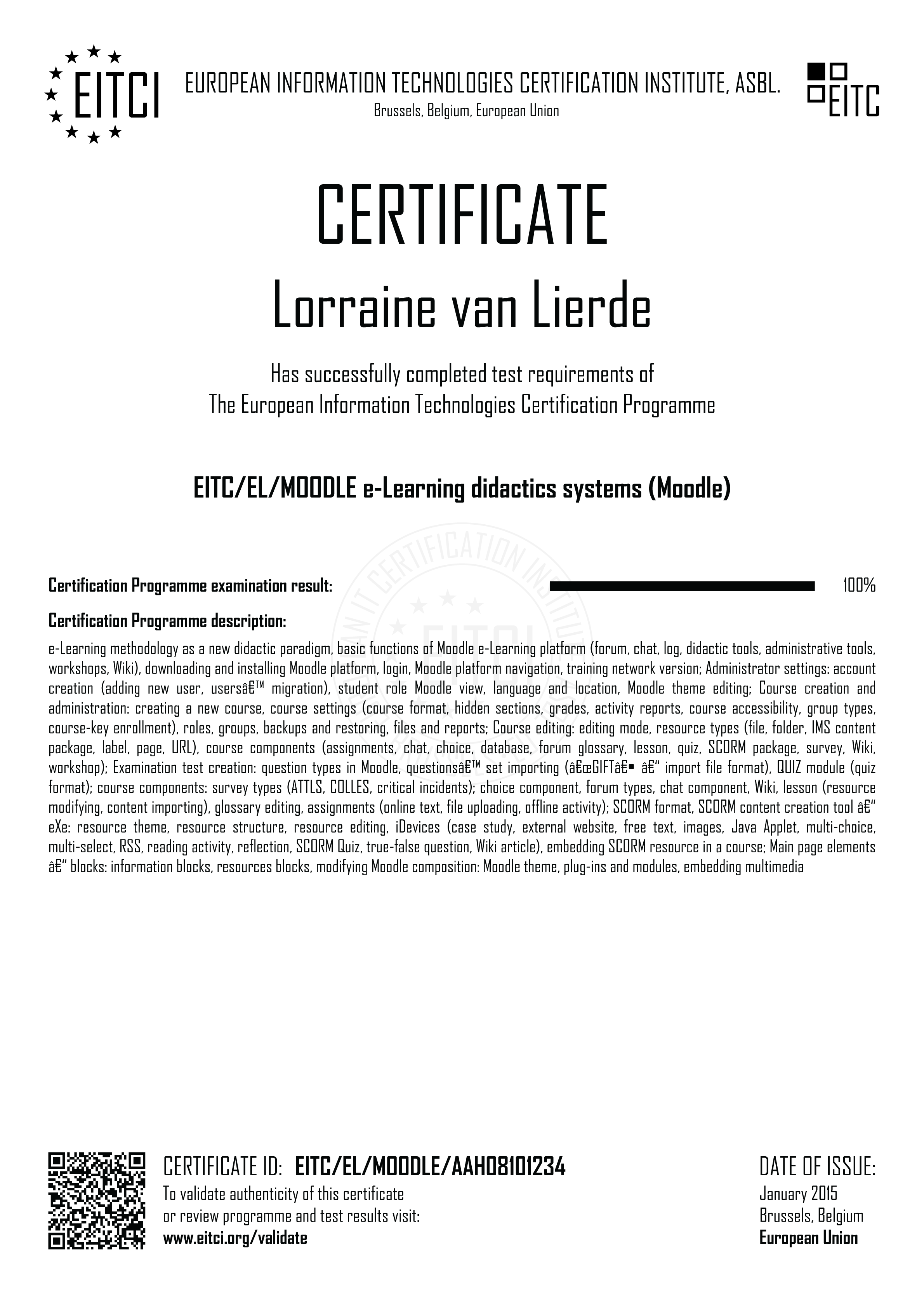 EITC/EL/MOODLE ই-লার্নিং ডডাটিক্স সিস্টেমগুলি (মুডল) শংসাপত্রের নমুনাটি নিম্নলিখিত: