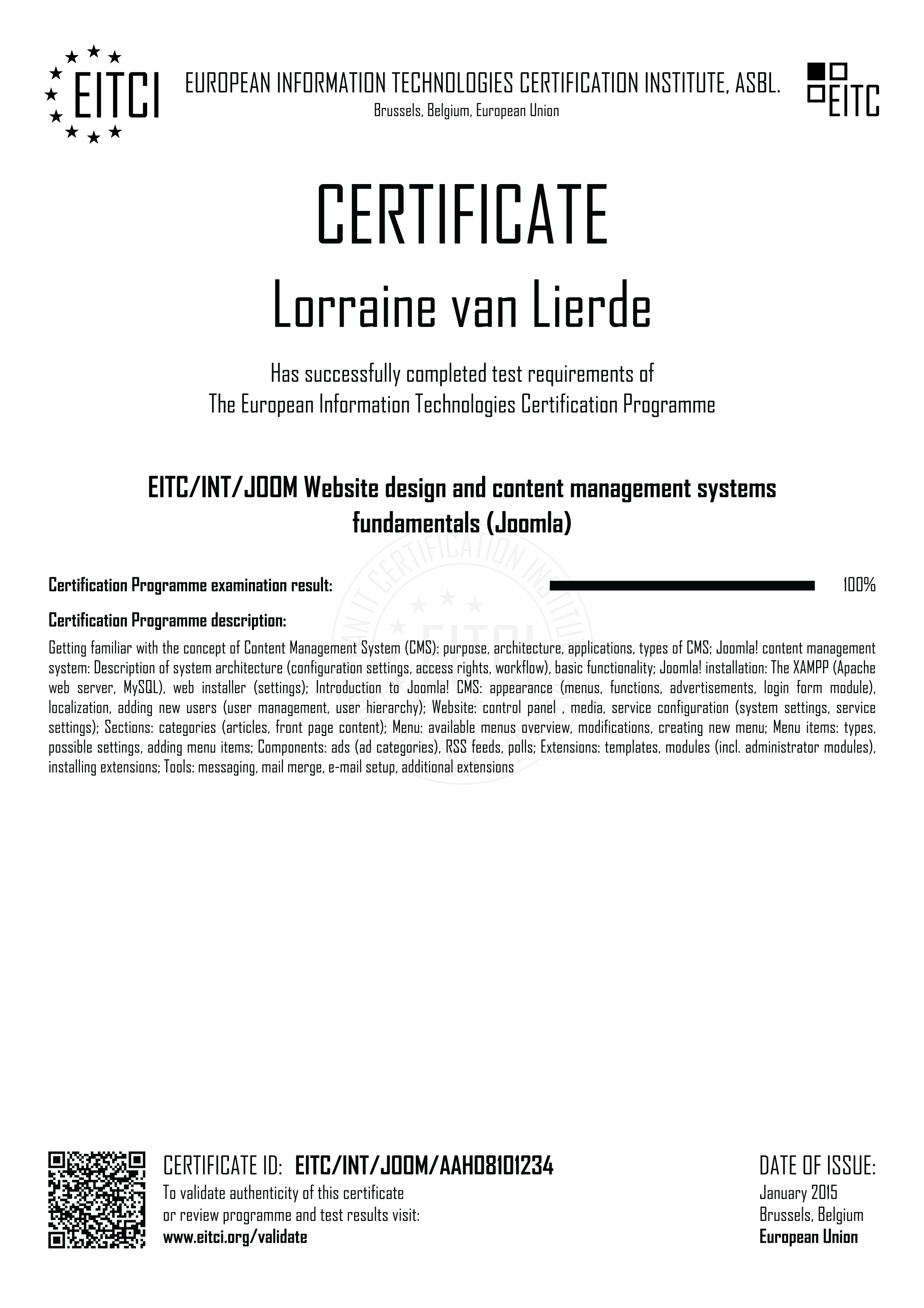 EITC/INT/JOOM ওয়েবসাইট ডিজাইন এবং কন্টেন্ট ম্যানেজমেন্ট সিস্টেমের ফান্ডামেন্টাল (জুমলা) শংসাপত্রের নমুনাটি নিম্নলিখিত: